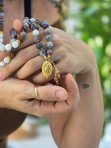 “Ogni volta che mediti con la tua Mālā annodata a mano, quando la senti intorno al collo o tra le tue dita e ogni volta in cui la luce viene catturata nei tuoi cristalli, diventa un promemoria delle tue intenzioni.