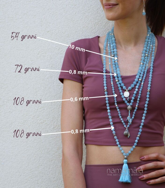 Anche la lunghezza e la dimensione dei grani sono fattori da prendere in considerazione in quanto esistono diverse tipologie. In questa foto puoi vedere indossati i 4 modelli più comuni. Ricorda che, le Mālā Namamālā, non essendo realizzate in serie, possono variare sempre di alcuni cm.