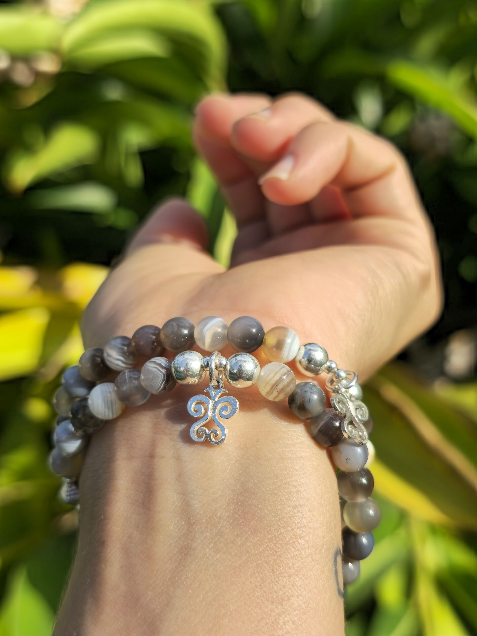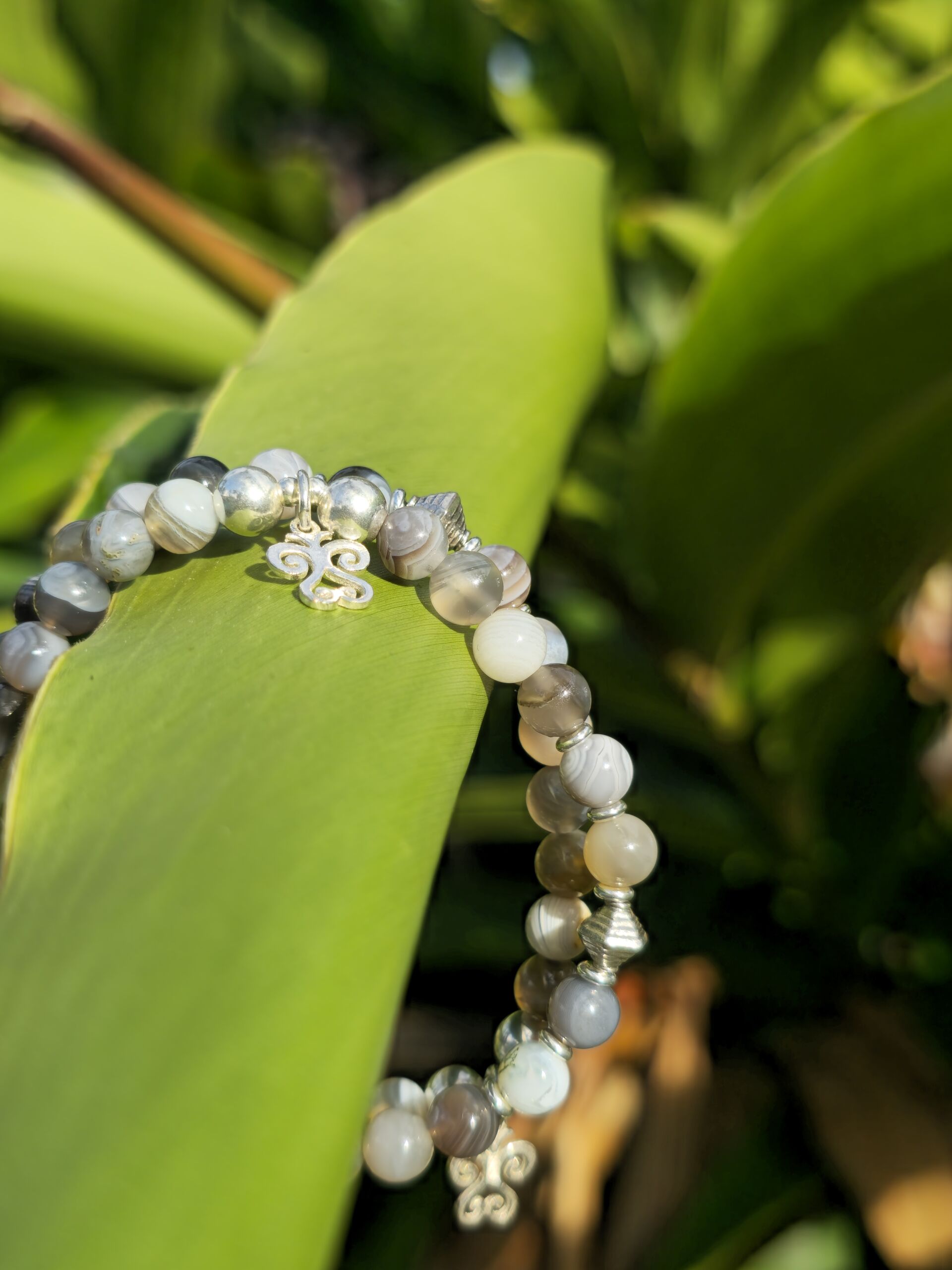 Agata Botswana, perla con lavorazione indonesiana, ciondolo con il simbolo Sankofa.