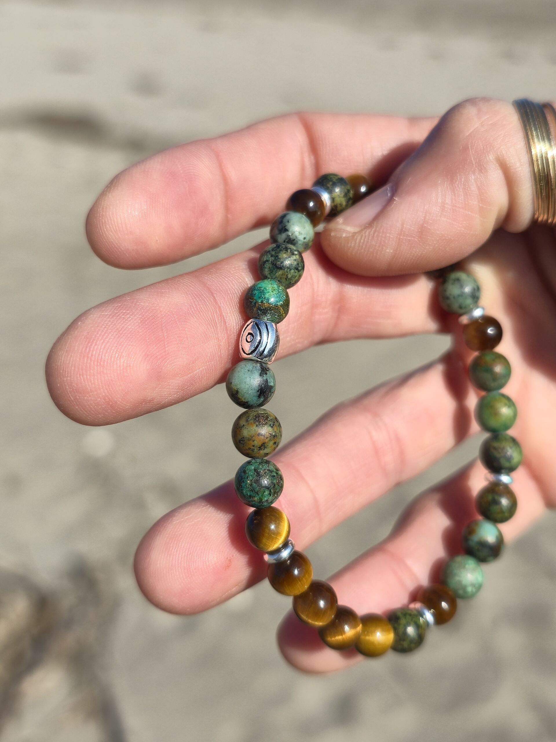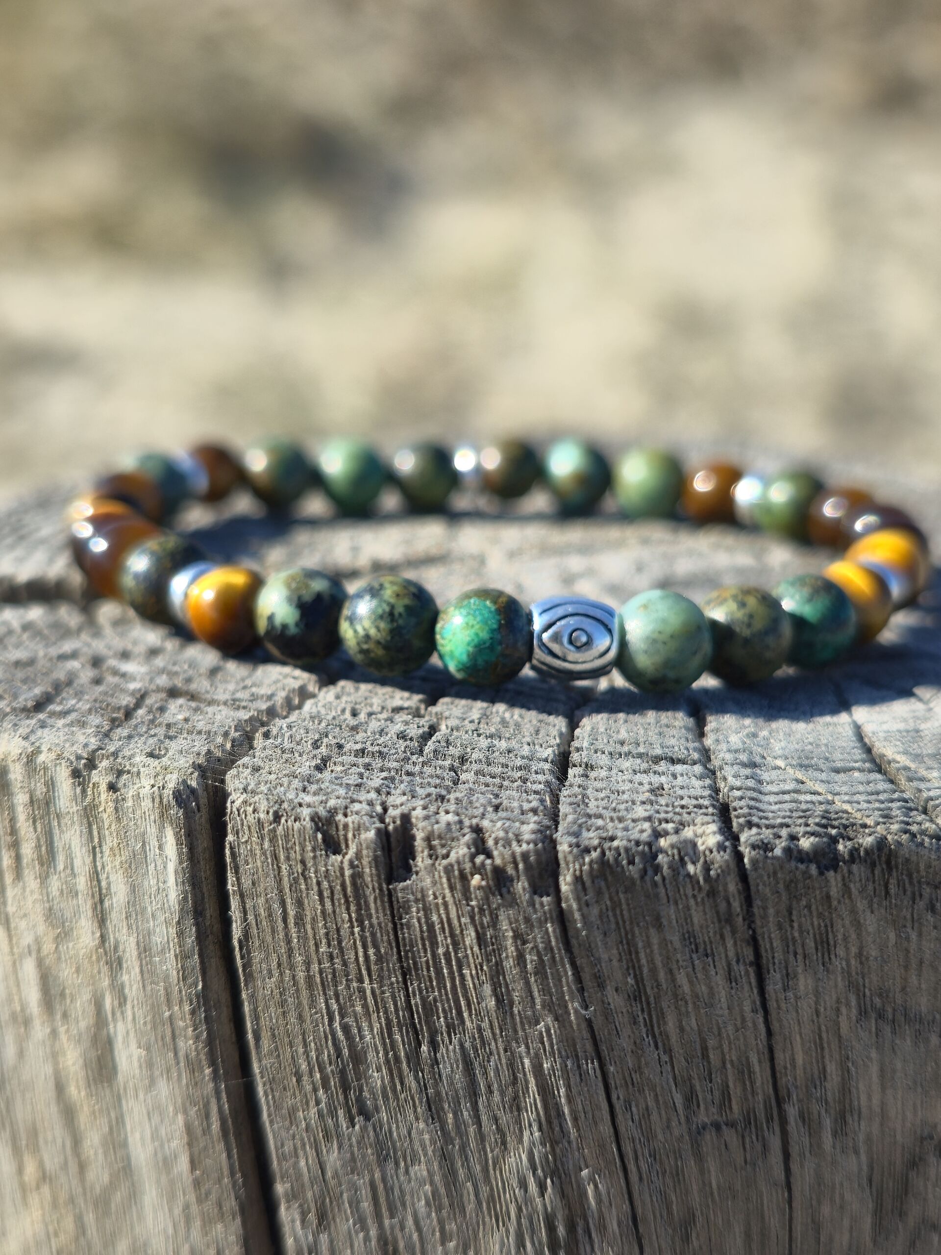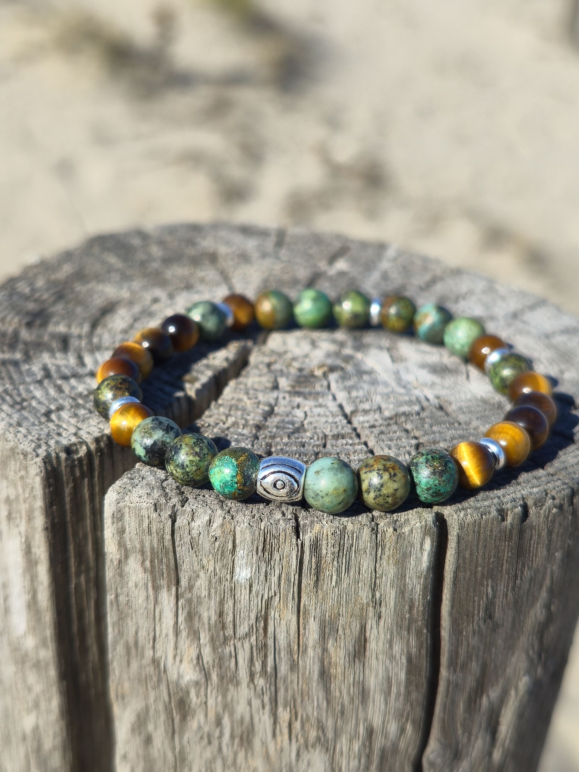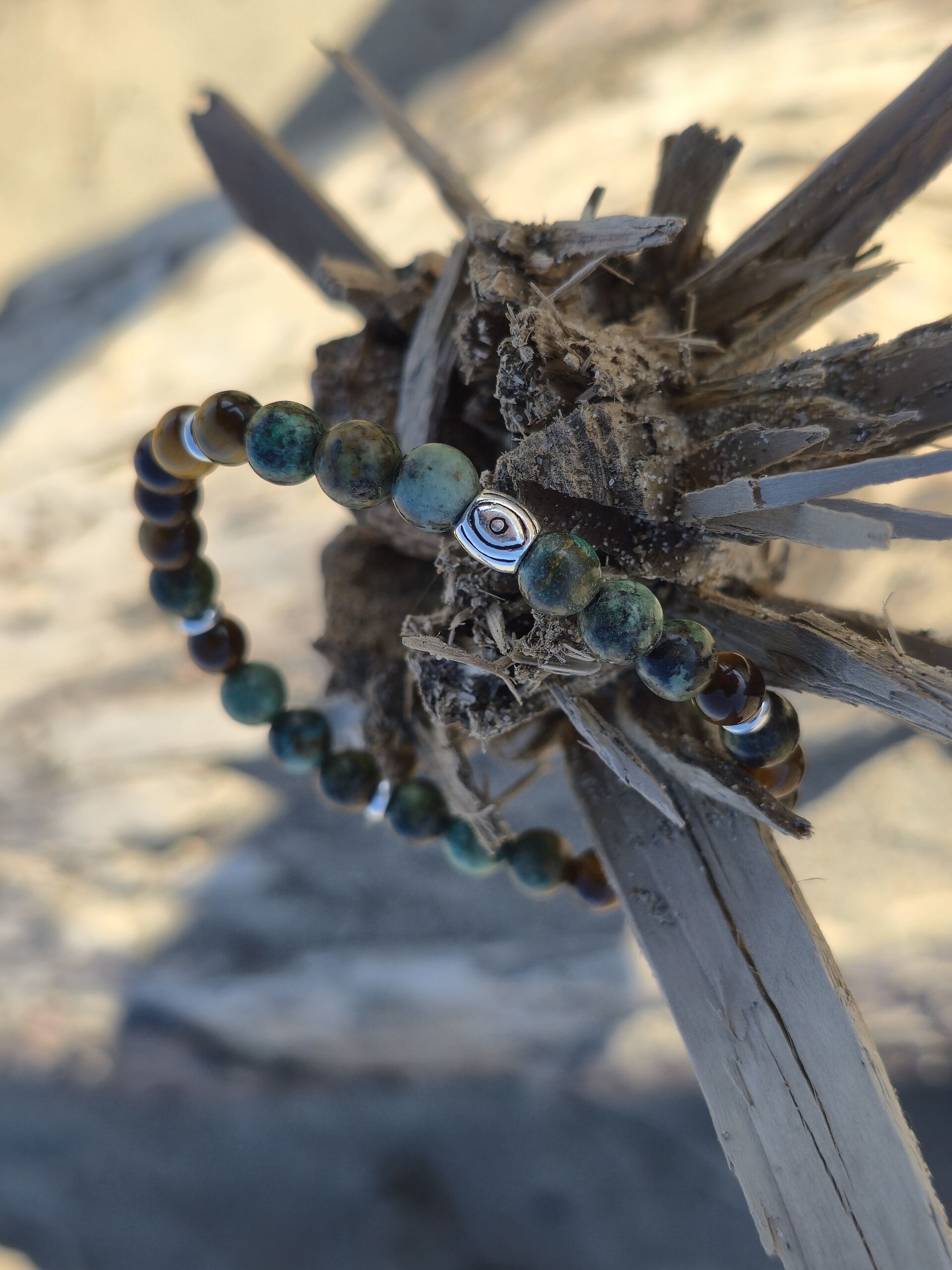 Turchese africano, Occhio di Tigre, perla centrale decorata con occhio protettivo “Nazar”.