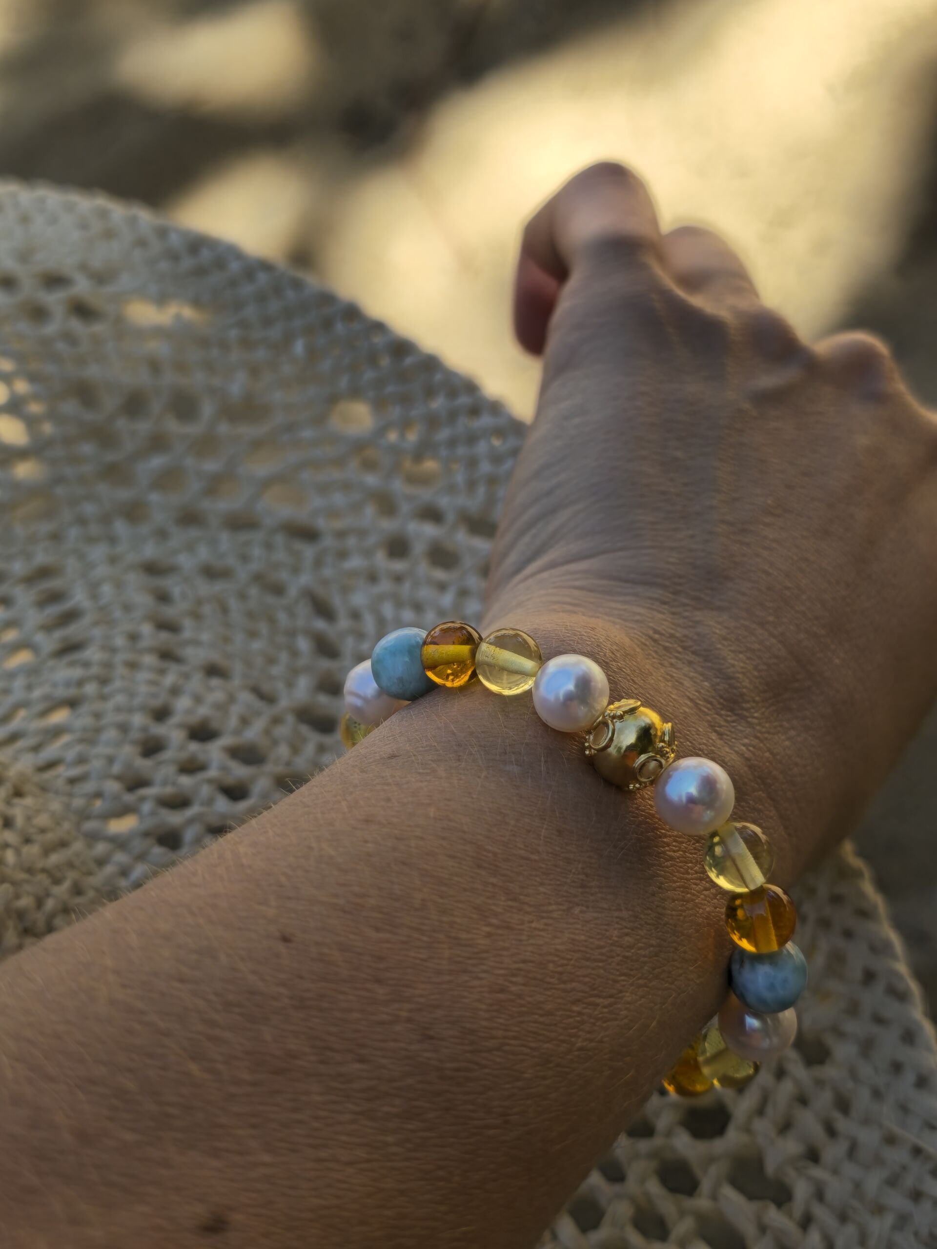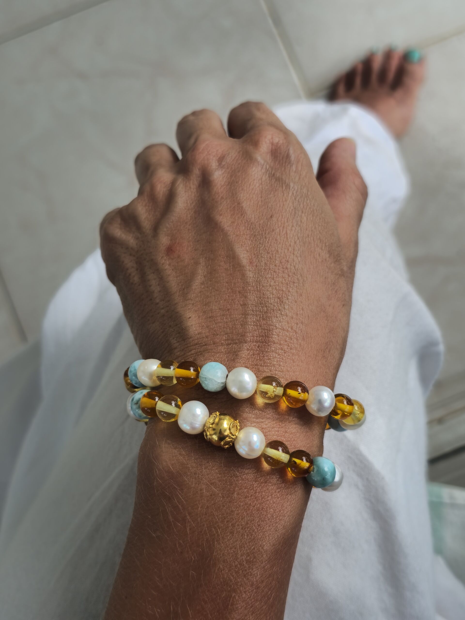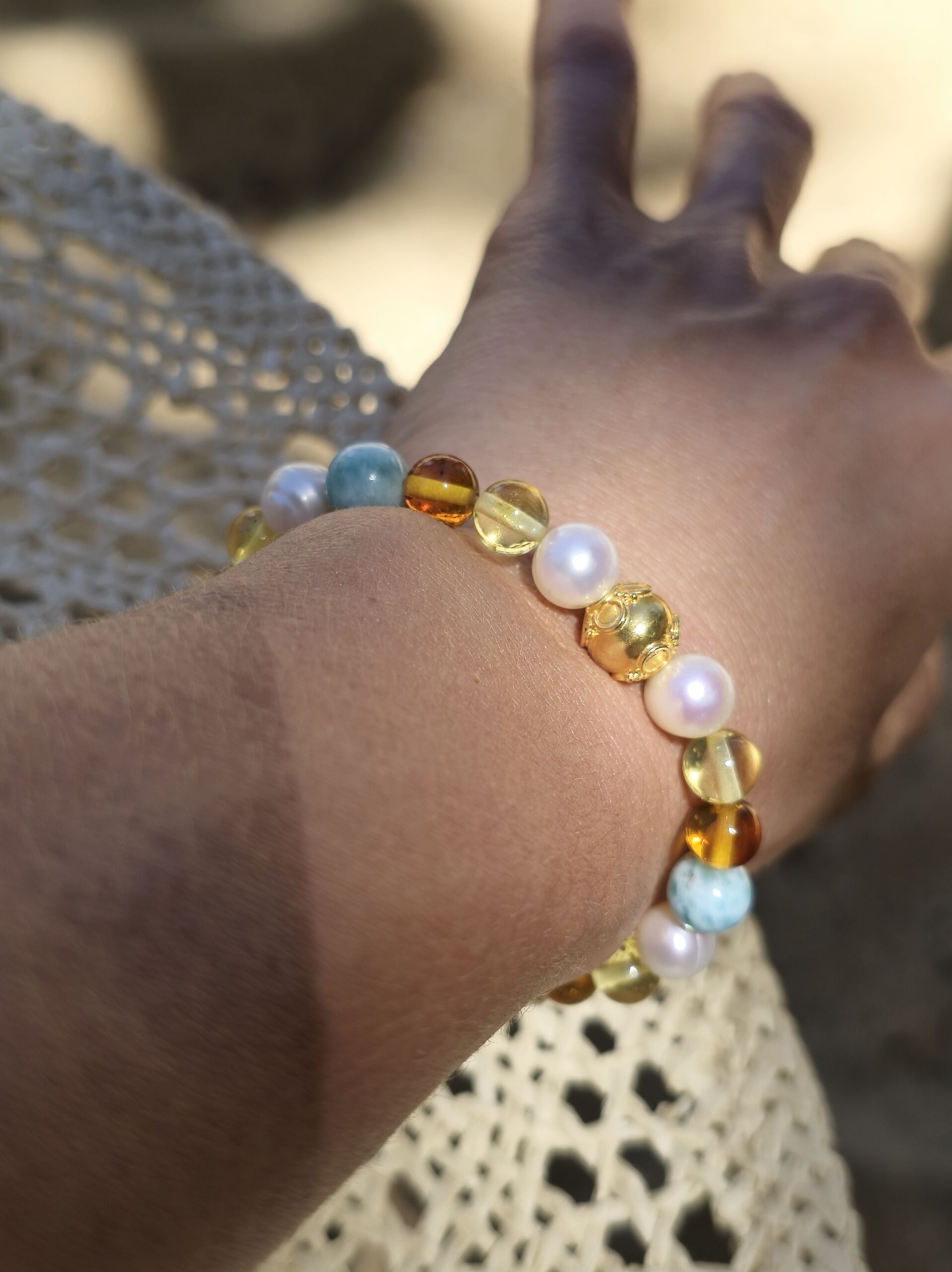 Perle coltivate d'acqua dolce, Ambra baltica 100% genuina in due tonalità colore, Larimar. Centrale perla con lavorazione indonesiana.