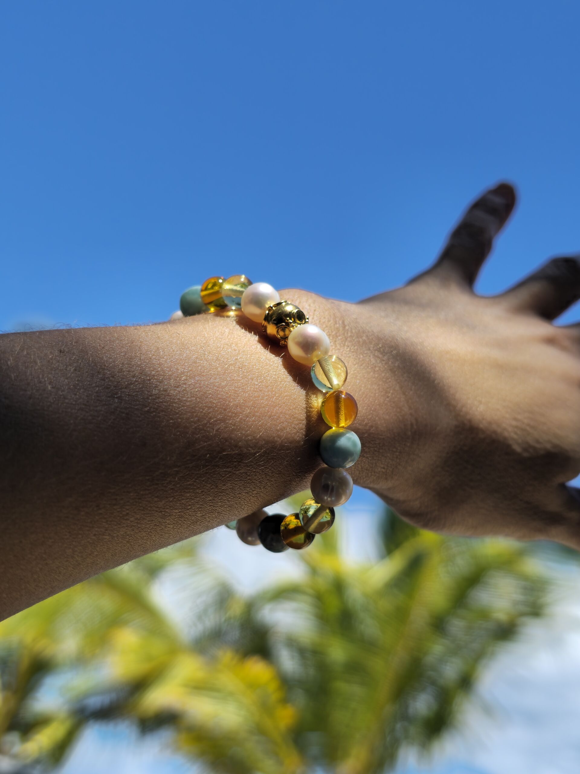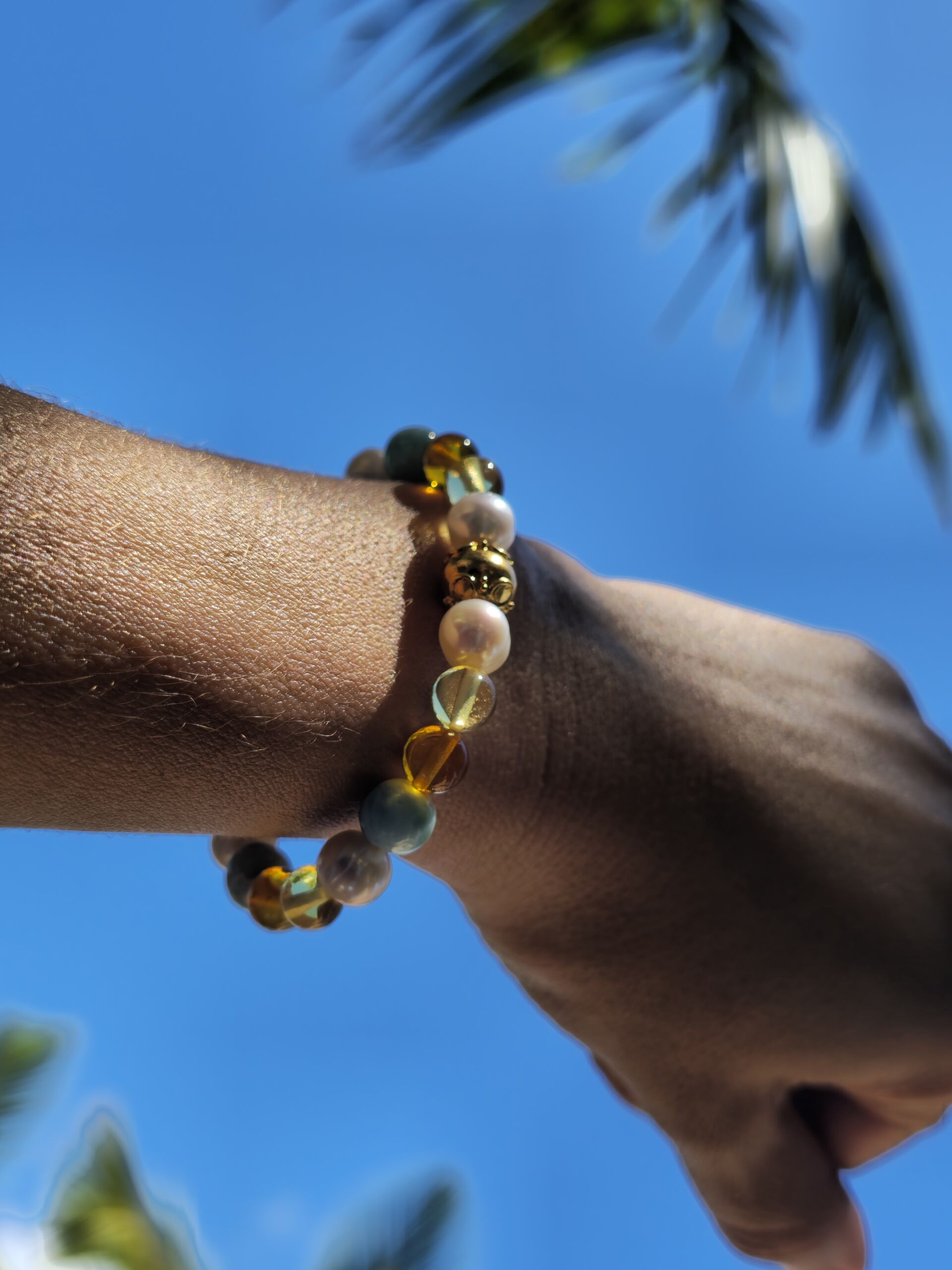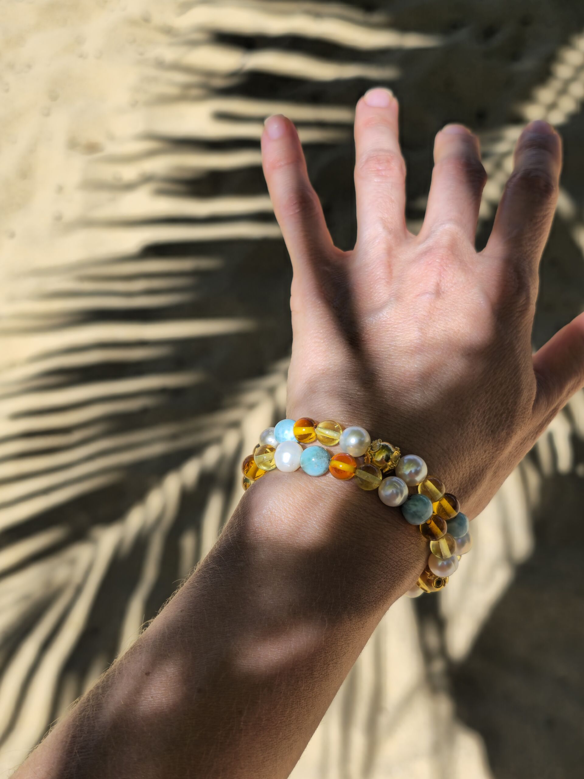 Perle coltivate d'acqua dolce, Ambra baltica 100% genuina in due tonalità colore, Larimar. Centrale perla con lavorazione indonesiana.
