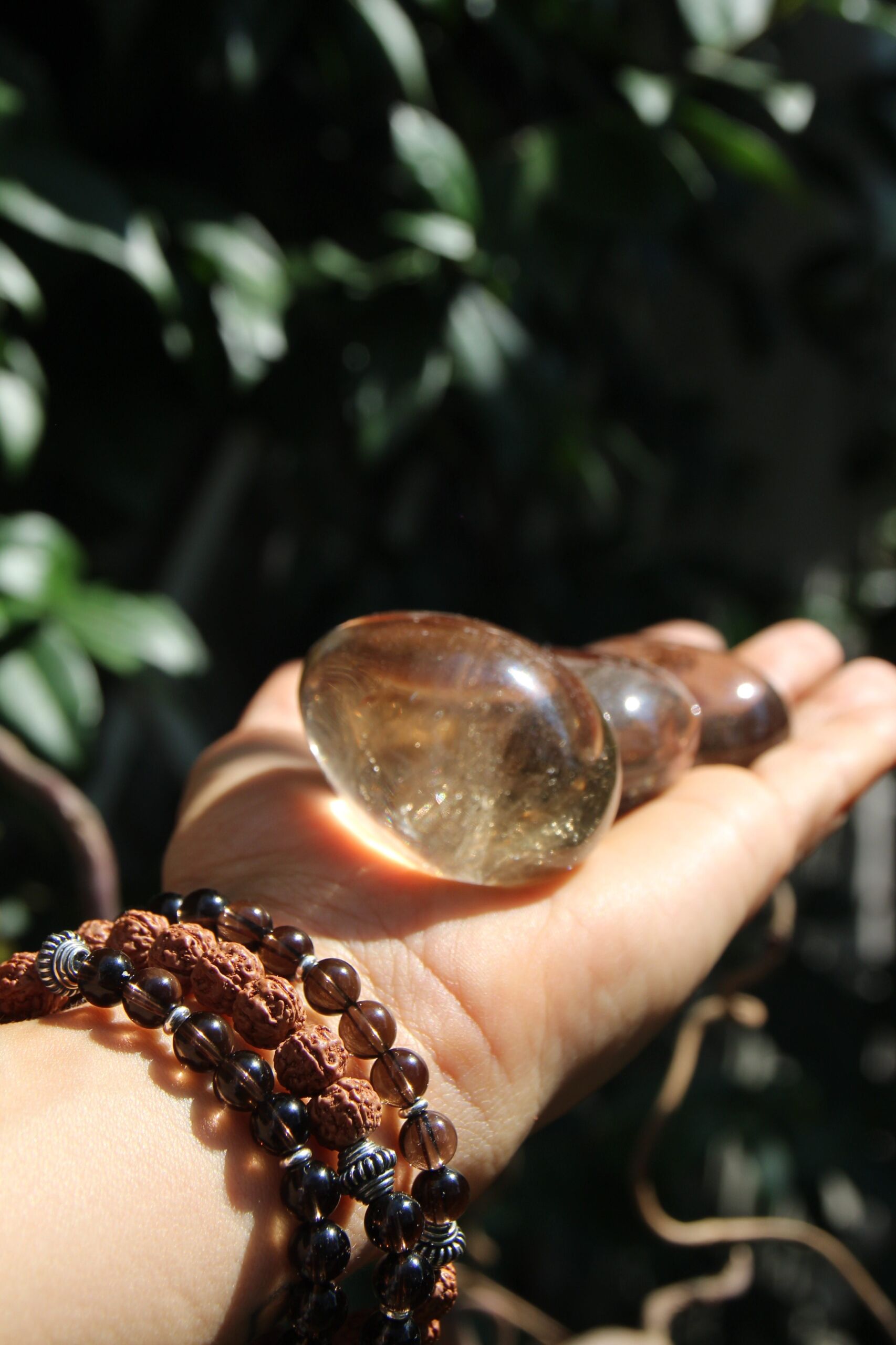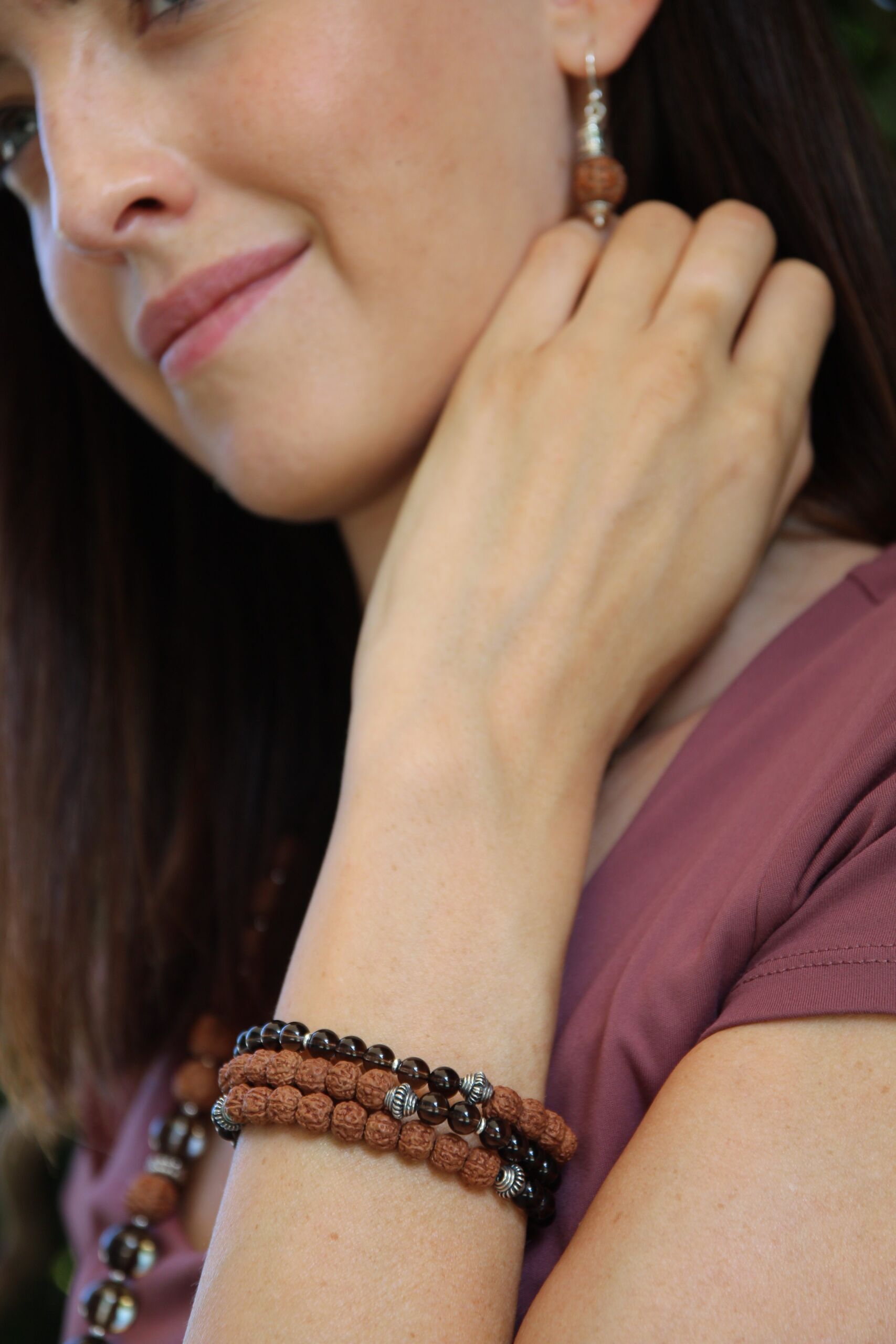 Quarzo fumè, 9 semi sacri indiani di Rudraksha, perle con lavorazione indonesiana.