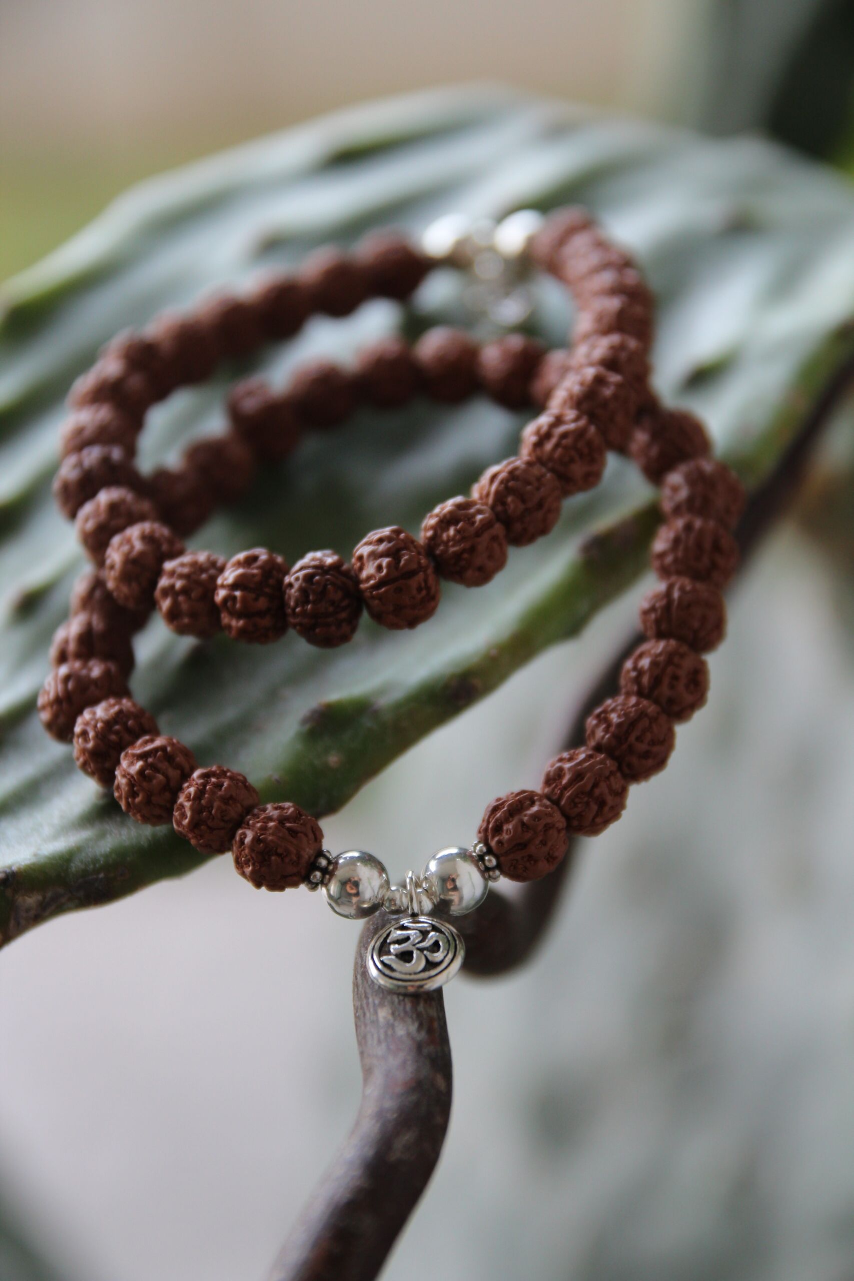 Semi sacri indiani di Rudraksha, ciondolo Om traforato.