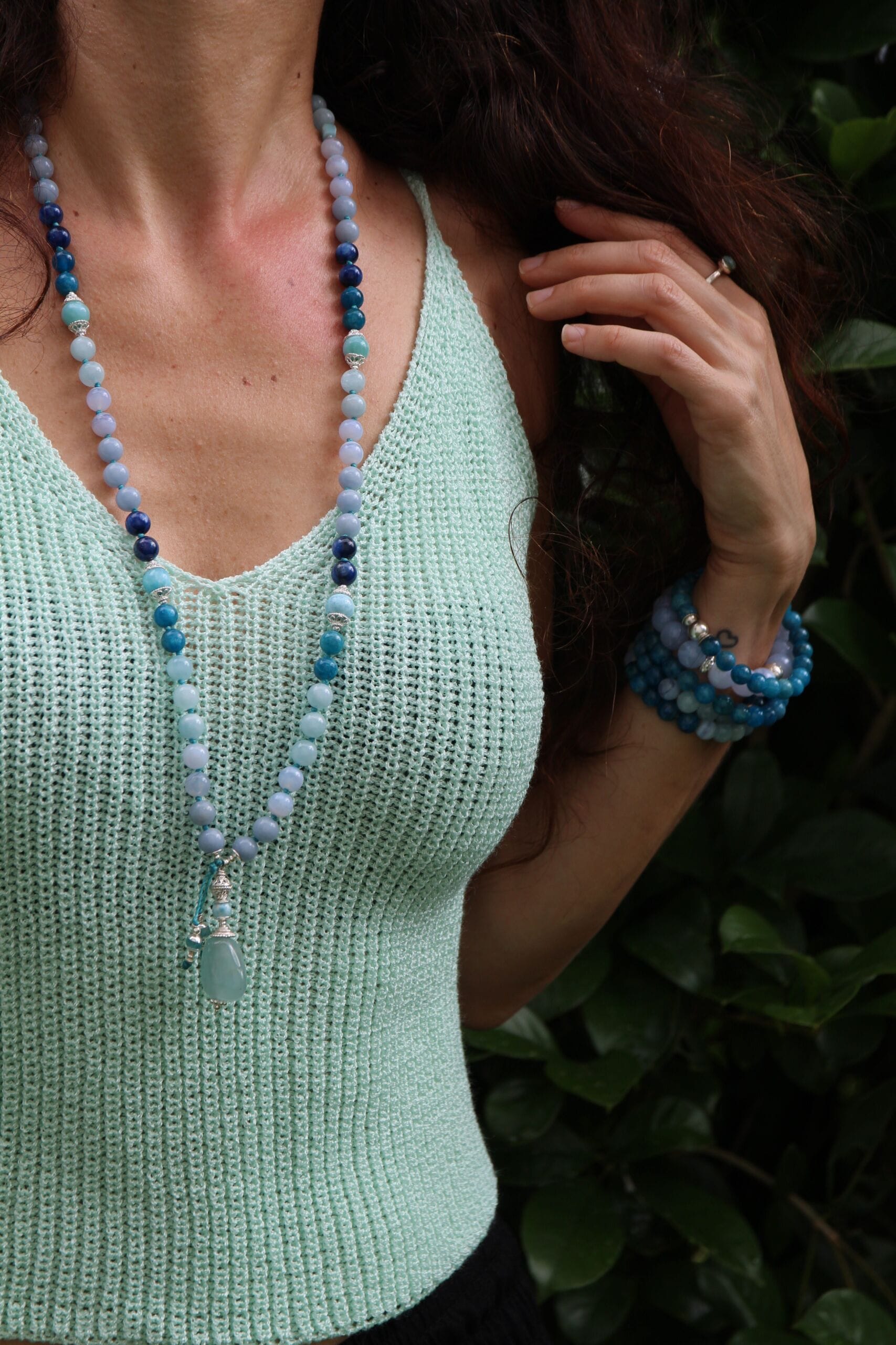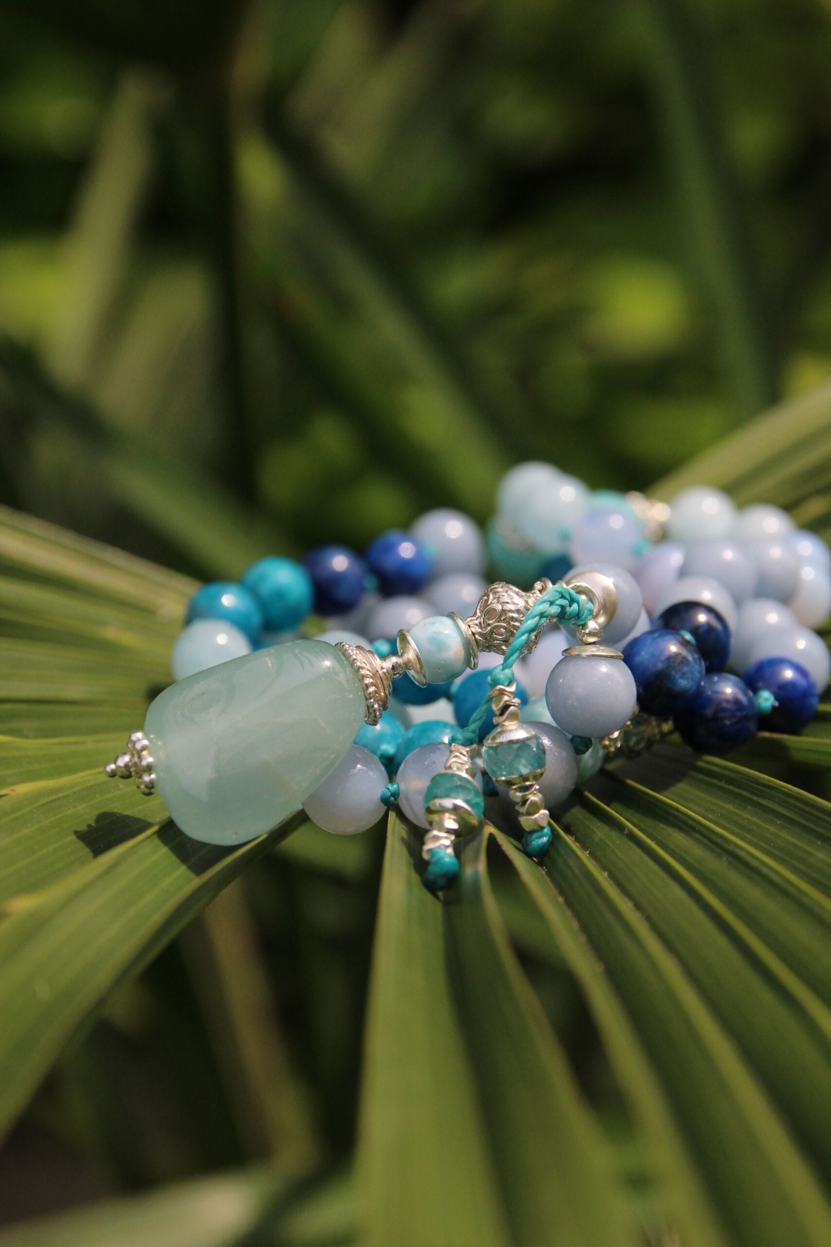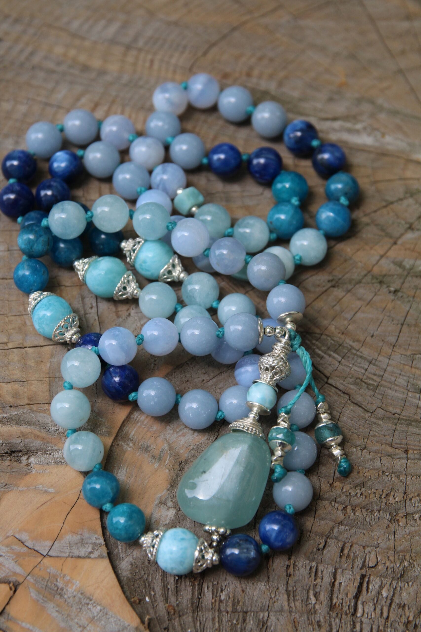 Mala creata con 72 grani di Cianite blu, Apatite blu, Angelite, Acquamarina e Calcedonio blu 8 mm, marcatori Larimar ed inseriti nel conteggio ogni 9 grani. Guru perla con lavorazione indonesiana e una pepita di Acquamarina. Tutto è argento 925.