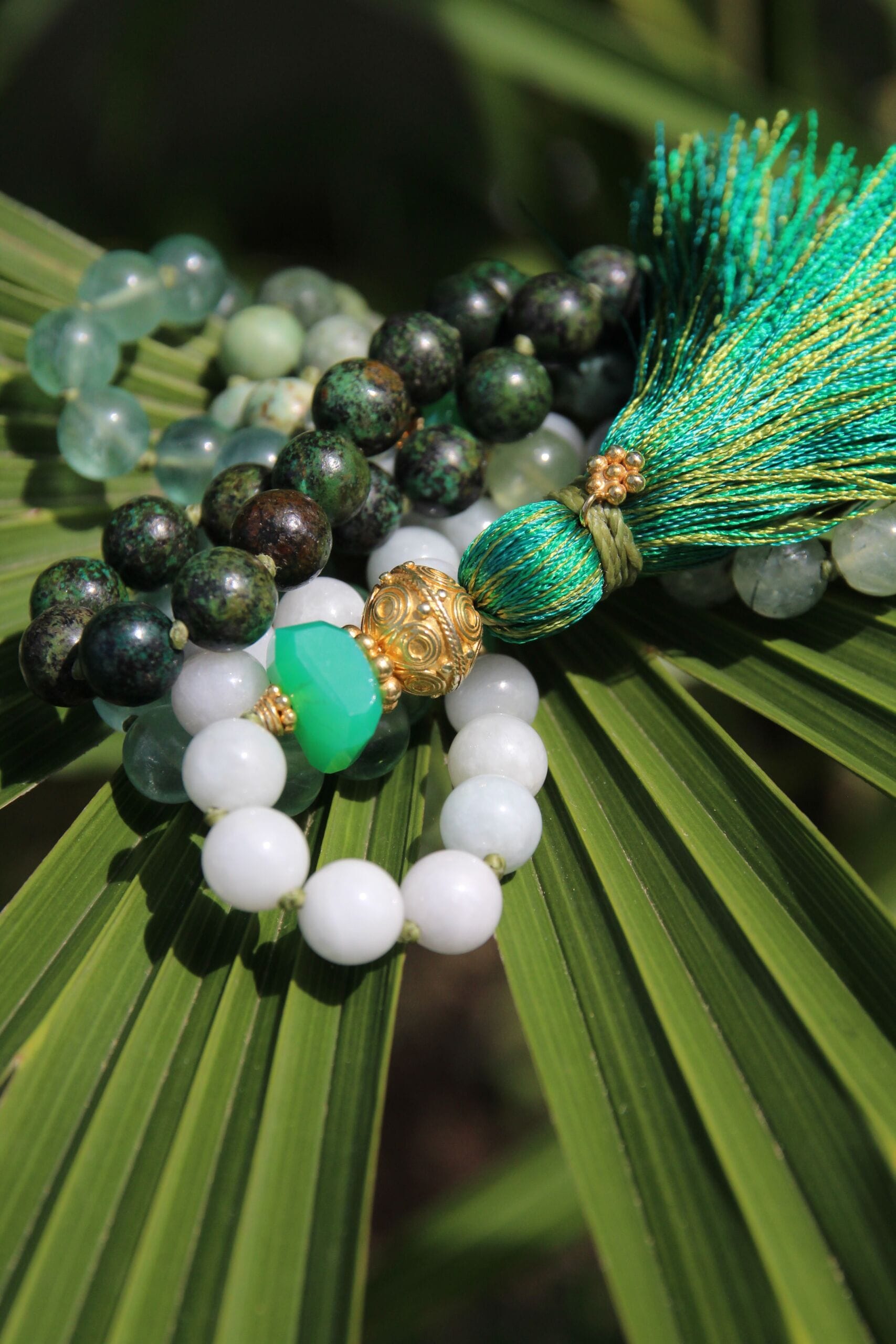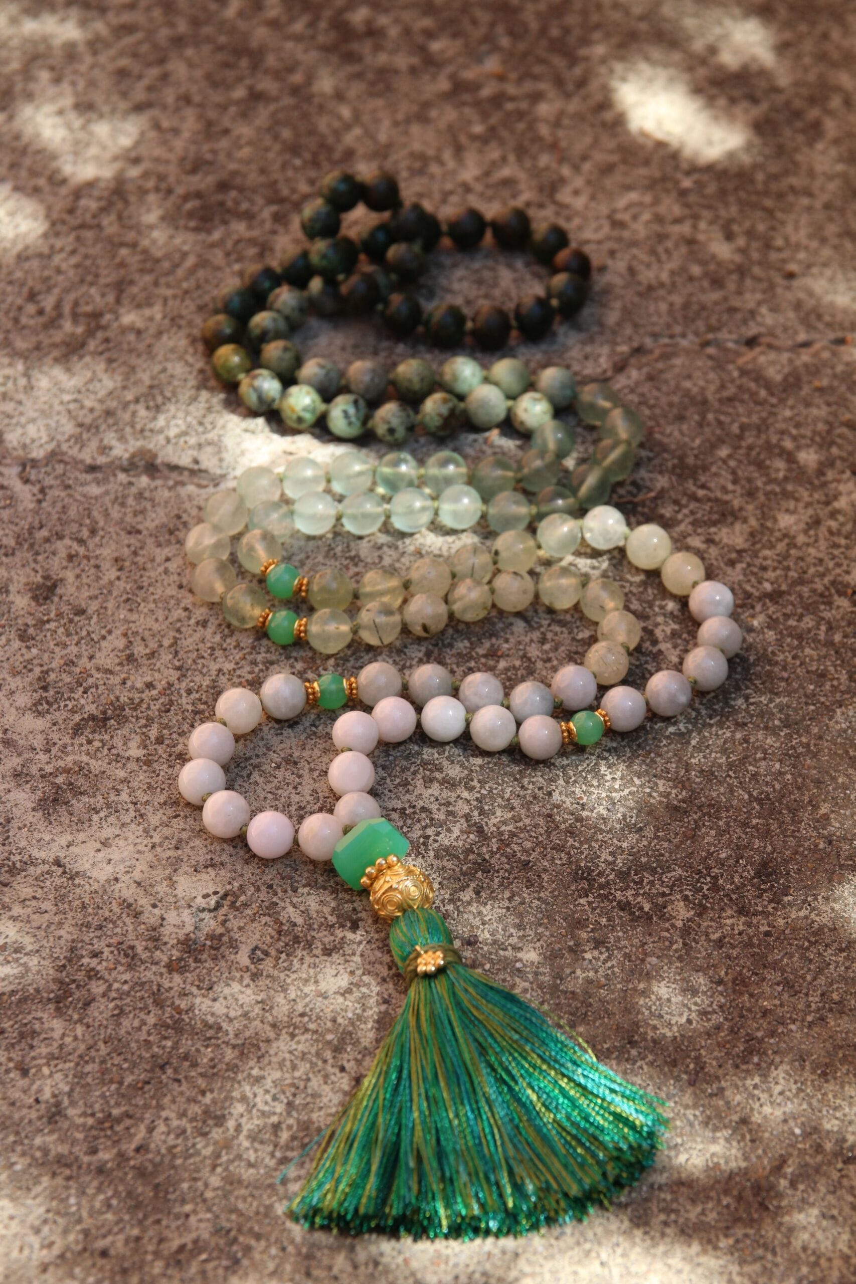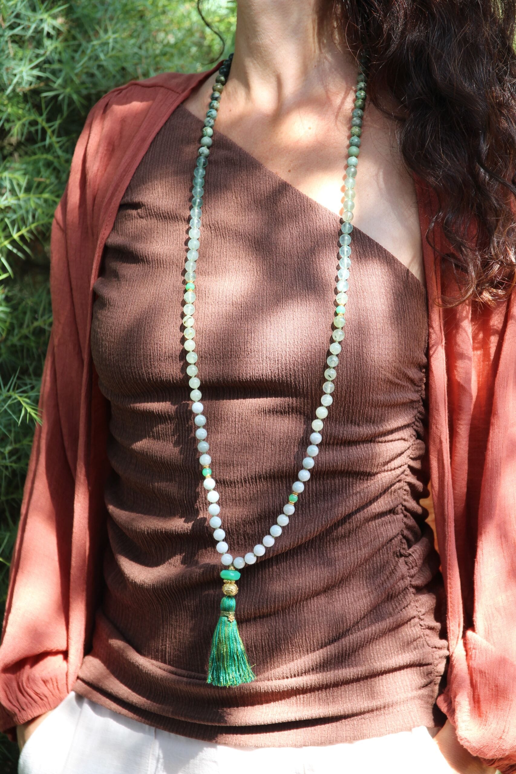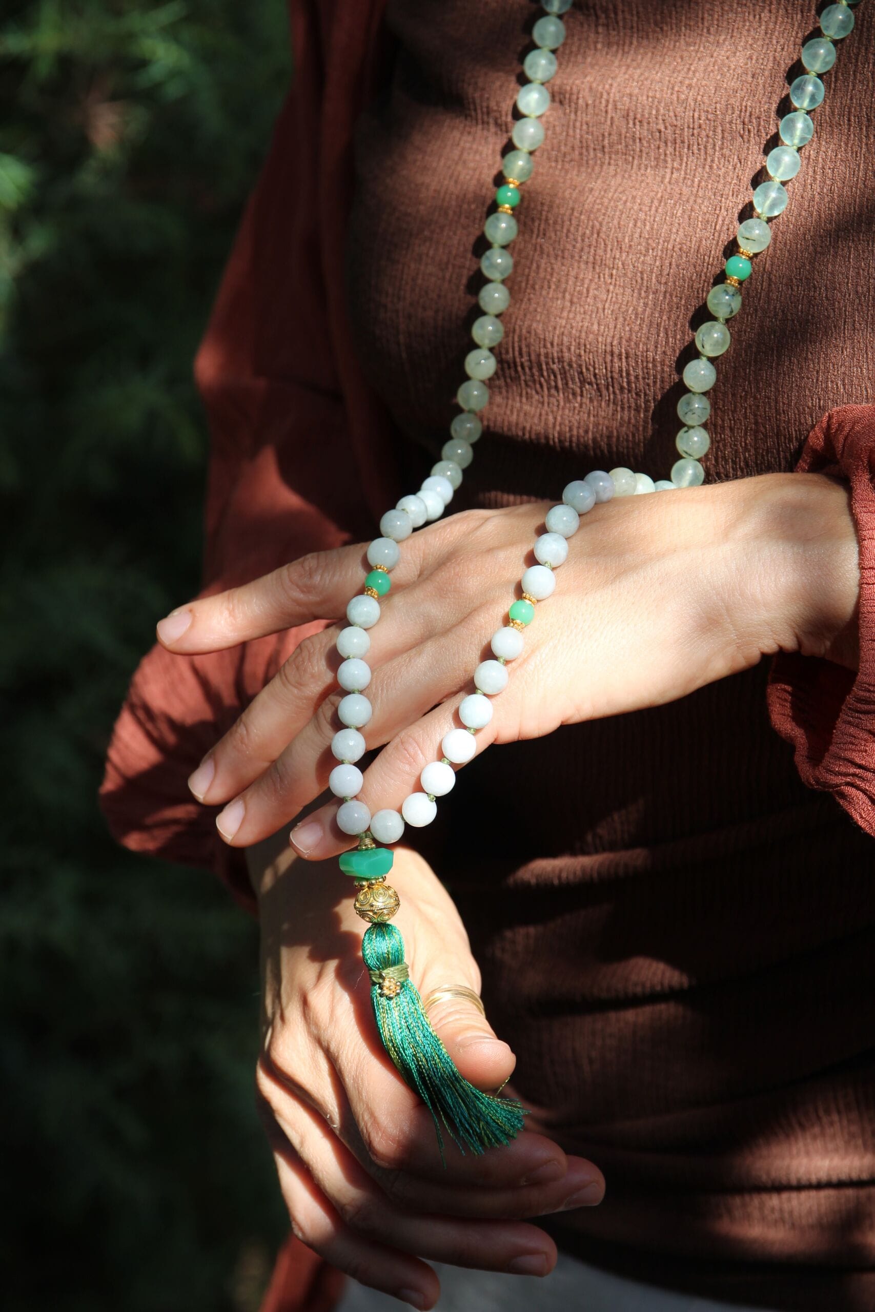 Una verde sfumatura di 108 grani di Fluorite verde, Prehnite, Giada verde (Birmania) e Turchese africano 8 mm. Marcatori pepite di Crisoprasio, Guru perla con lavorazione indonesiana e pepita di Crisoprasio. La nappina in seta multicolore richiama i colori della sfumatura. Tutto è argento 925 con placcatura oro.