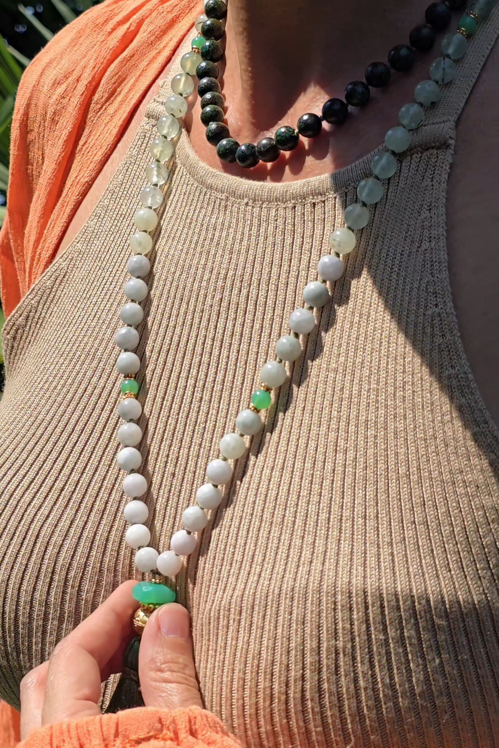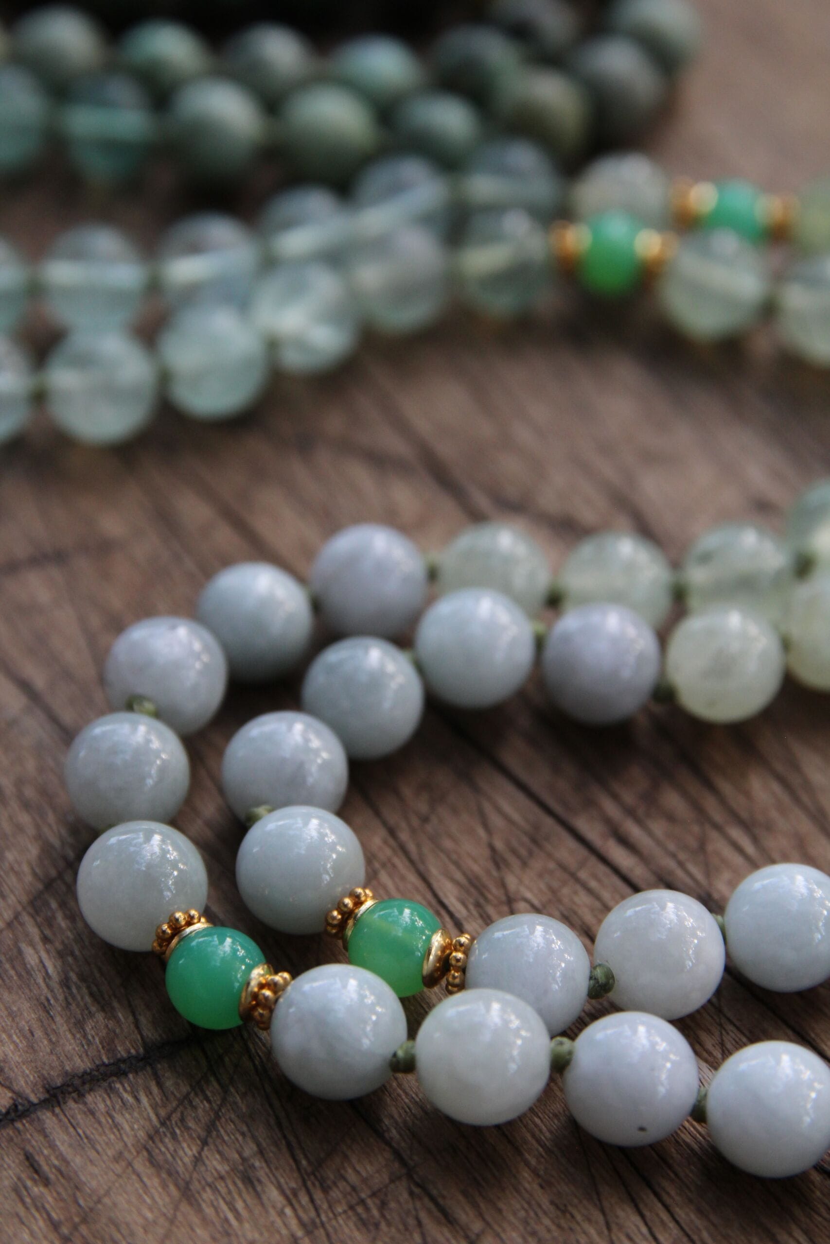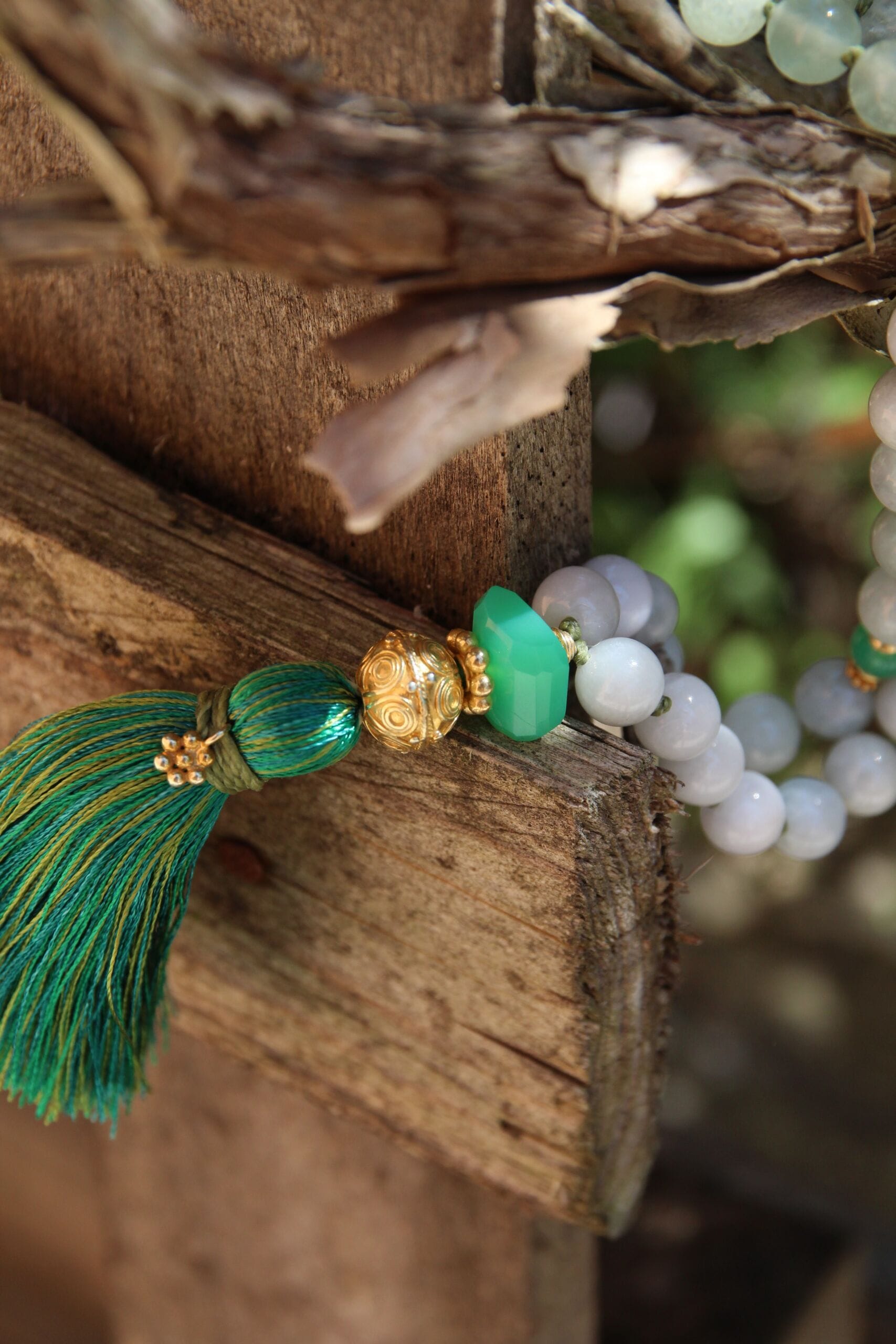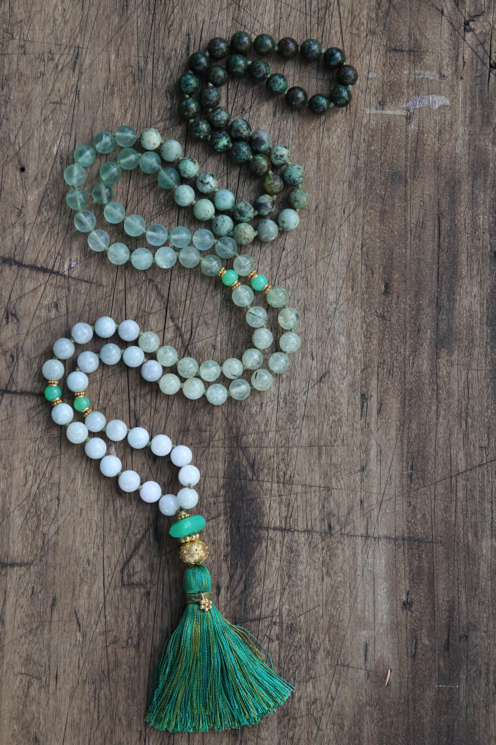 Una verde sfumatura di 108 grani di Fluorite verde, Prehnite, Giada verde (Birmania) e Turchese africano 8 mm. Marcatori pepite di Crisoprasio, Guru perla con lavorazione indonesiana e pepita di Crisoprasio. La nappina in seta multicolore richiama i colori della sfumatura. Tutto è argento 925 con placcatura oro.