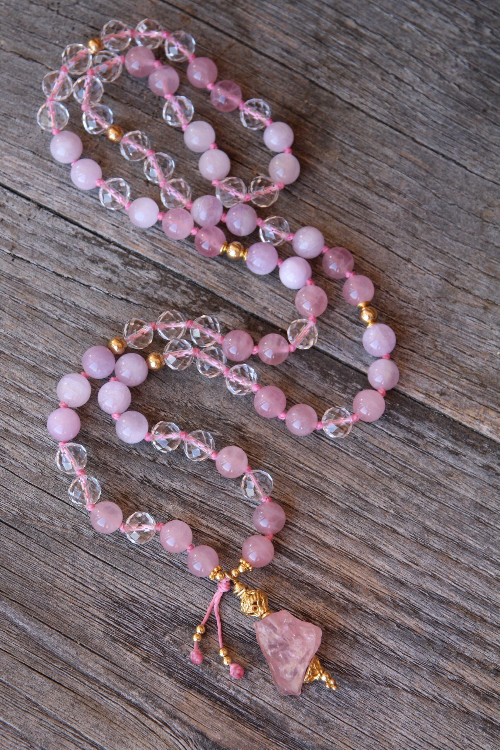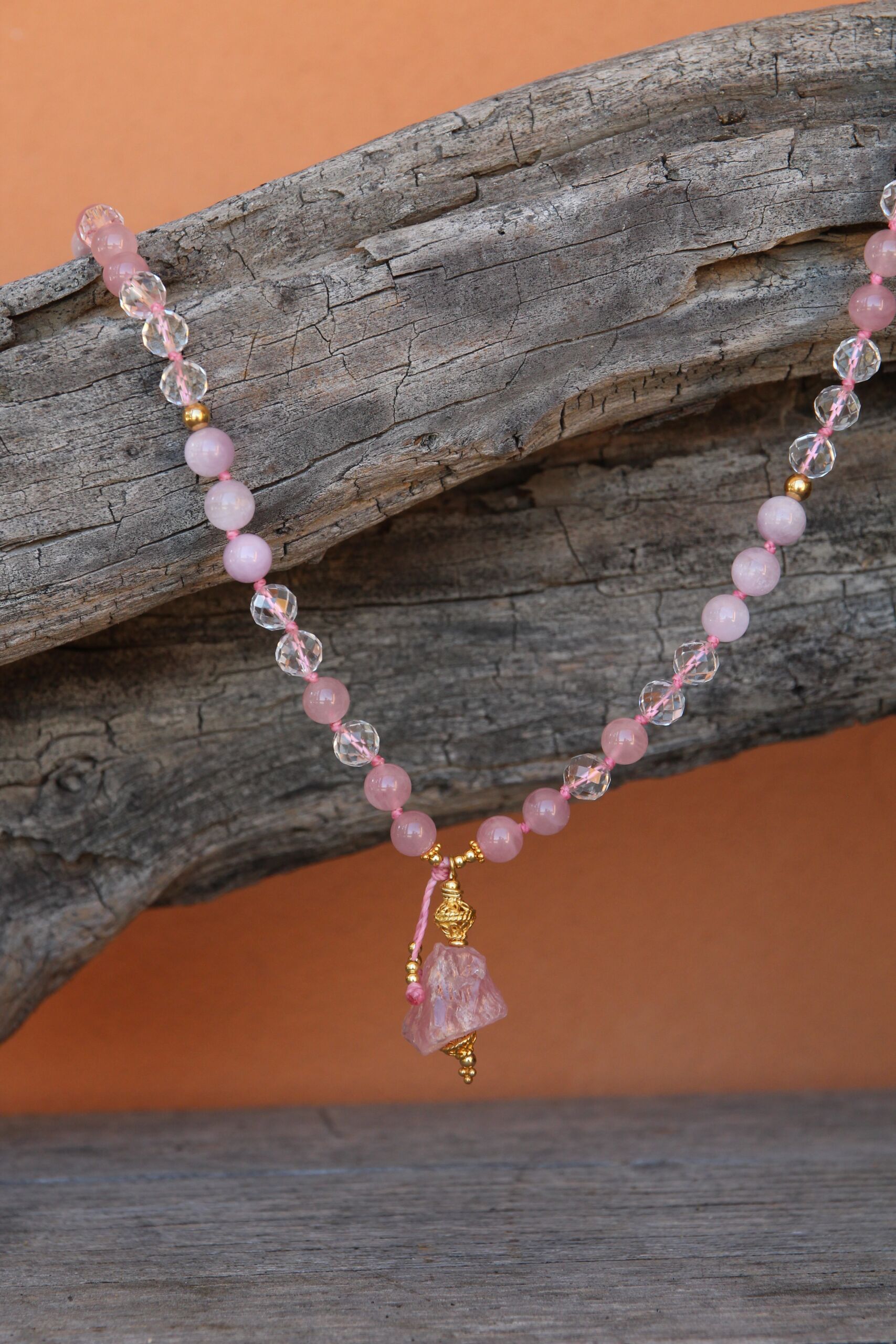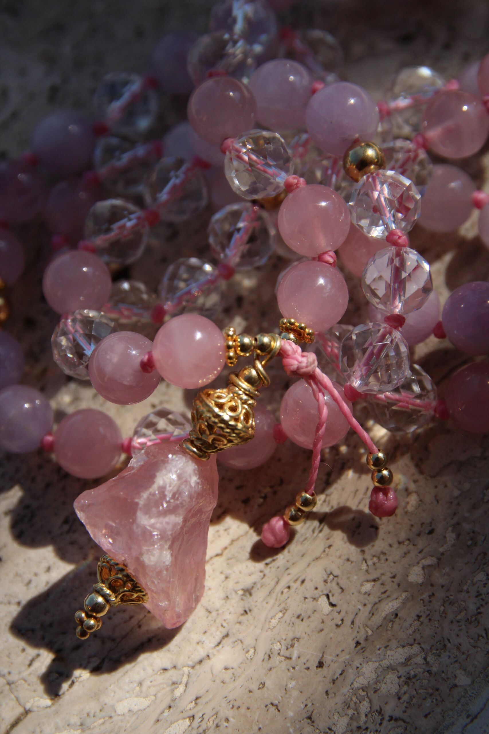 72 grani di Quarzo rosa del Madagascar, Quarzo ialino sfaccettato e Kunzite 8 mm. Marcatori perle oro ed inserite nel conteggio ogni 9 grani. Guru Quarzo rosa grezzo. Tutto è argento 925 con placcatura oro.