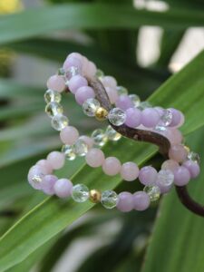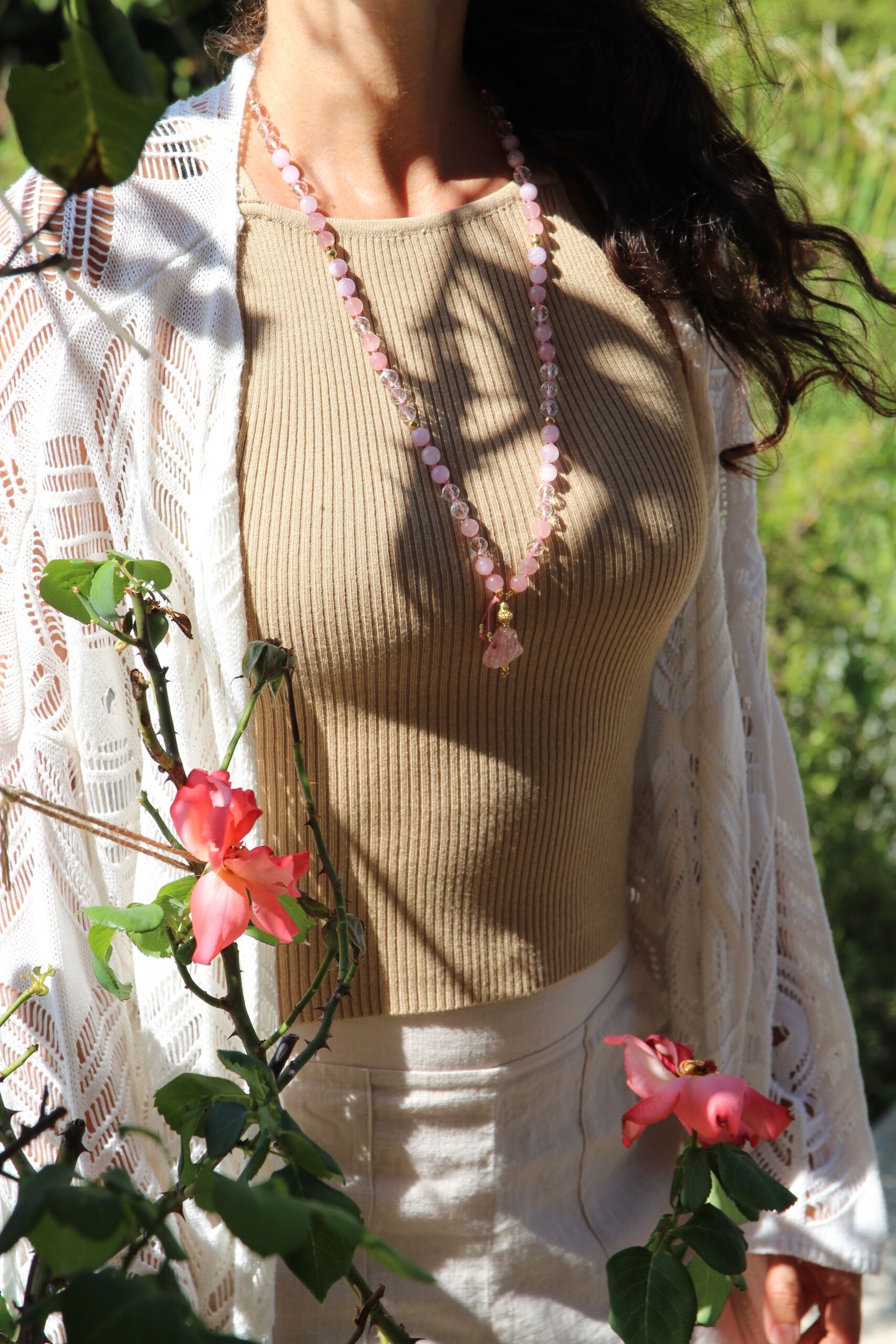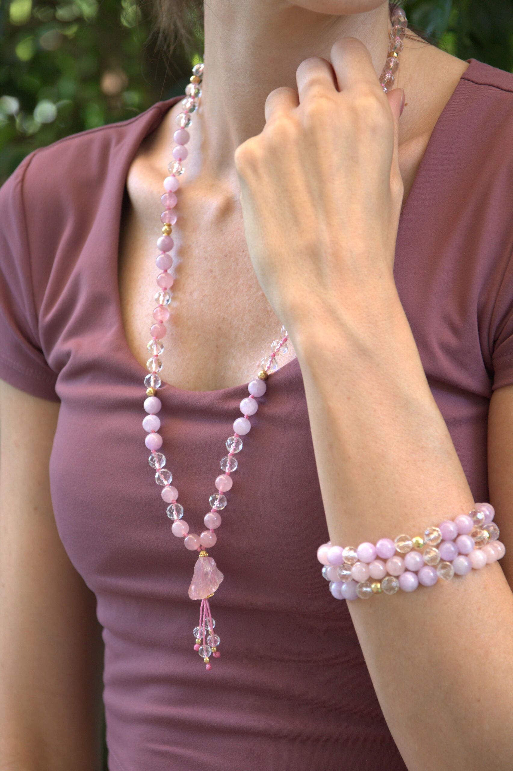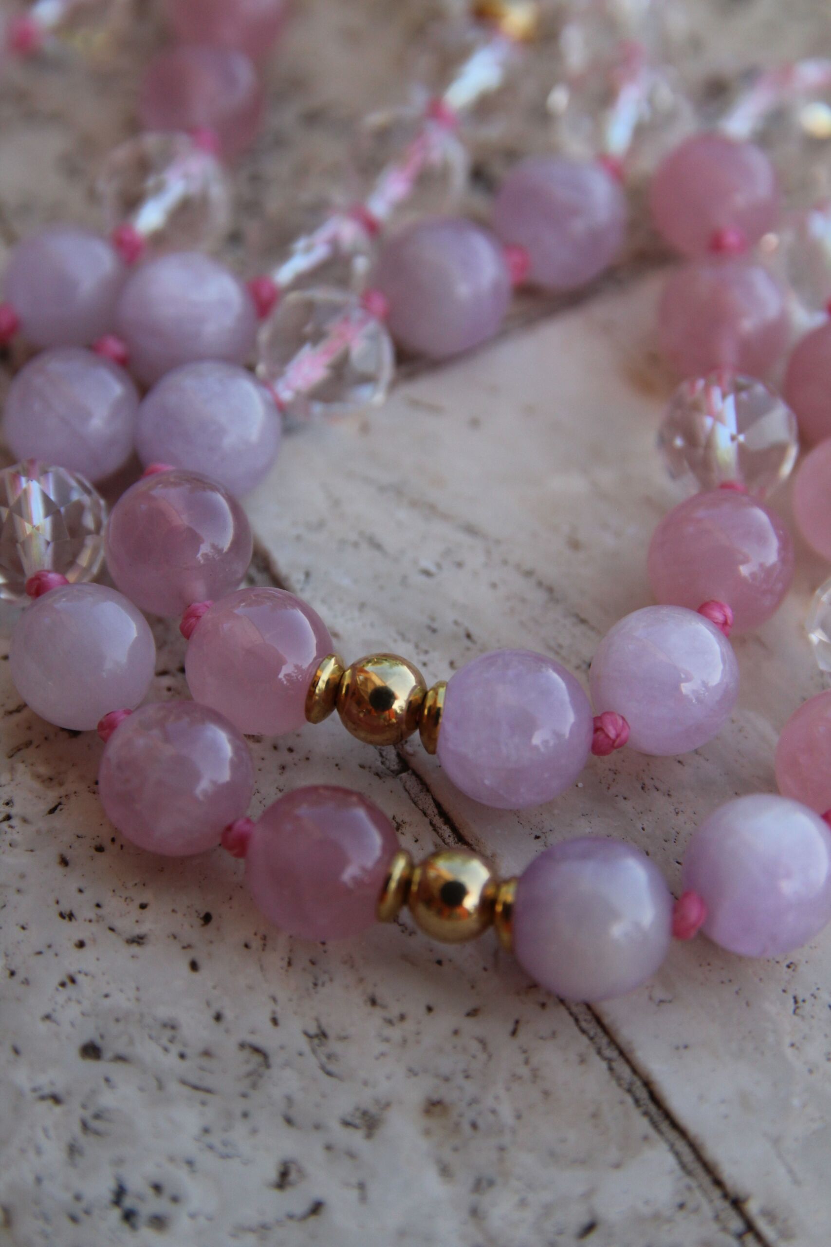72 grani di Quarzo rosa del Madagascar, Quarzo ialino sfaccettato e Kunzite 8 mm. Marcatori perle oro ed inserite nel conteggio ogni 9 grani. Guru Quarzo rosa grezzo. Tutto è argento 925 con placcatura oro.