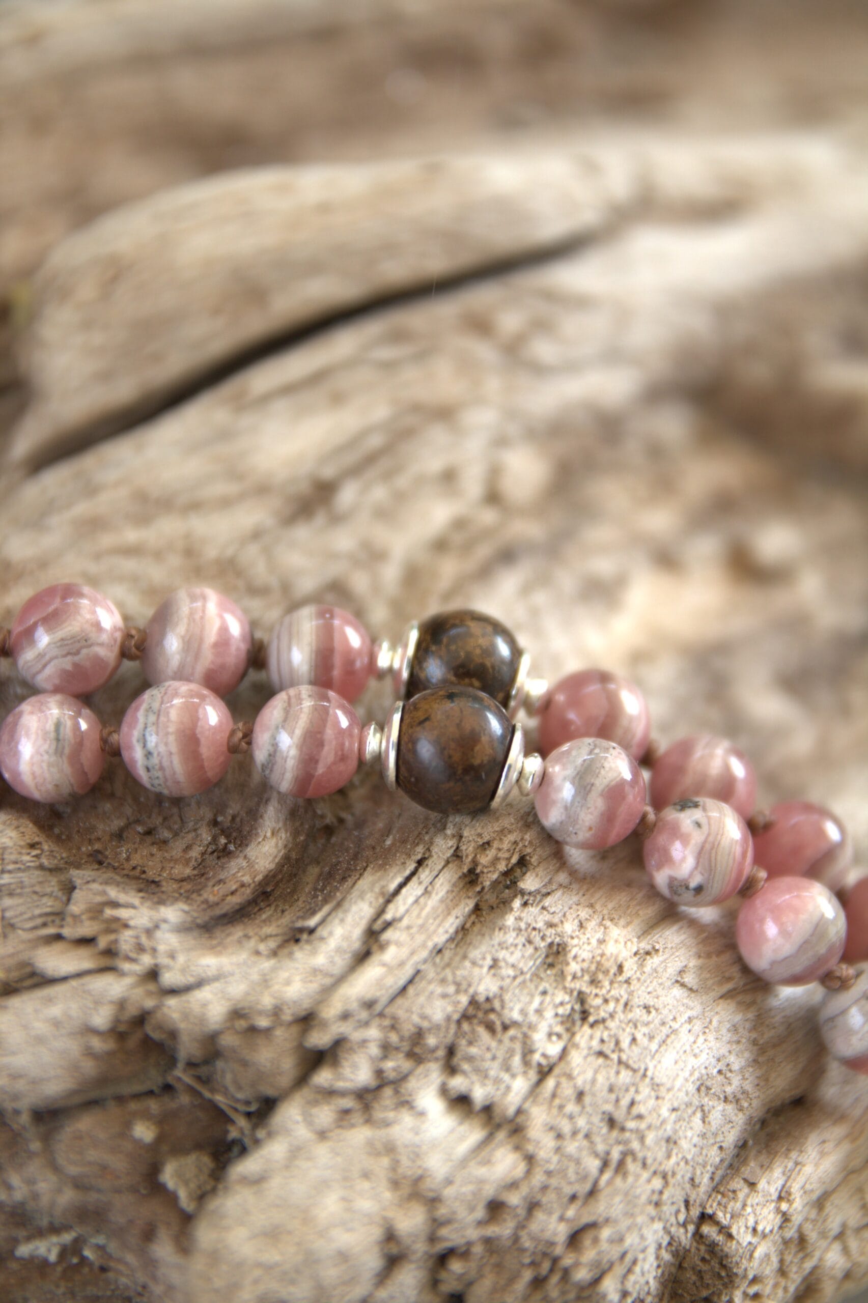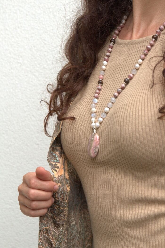 Creata con 72 grani di Rodocrosite, Labradorite bianca, perle coltivate d’acqua dolce 8 mm. Marcatori pietre di Bronzite ed inserite nel conteggio ogni 9 grani. Guru pendente di Rodocrosite.
