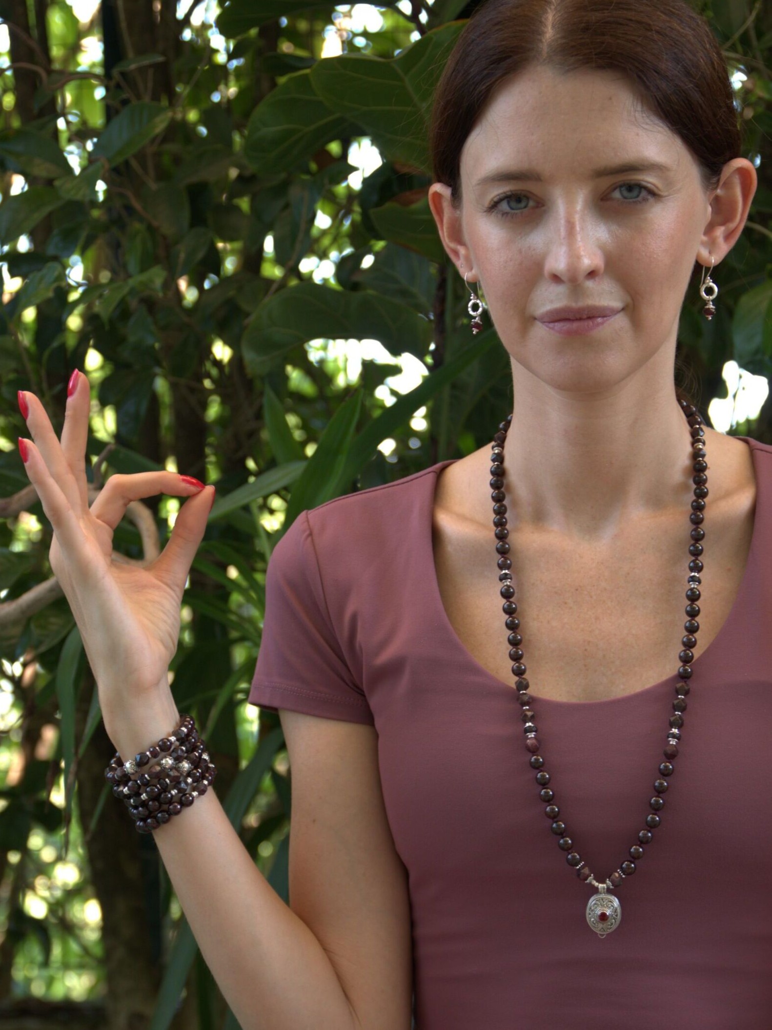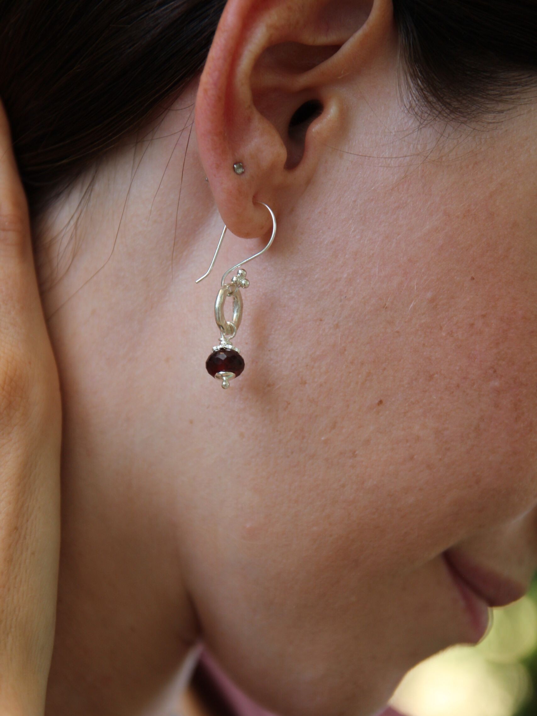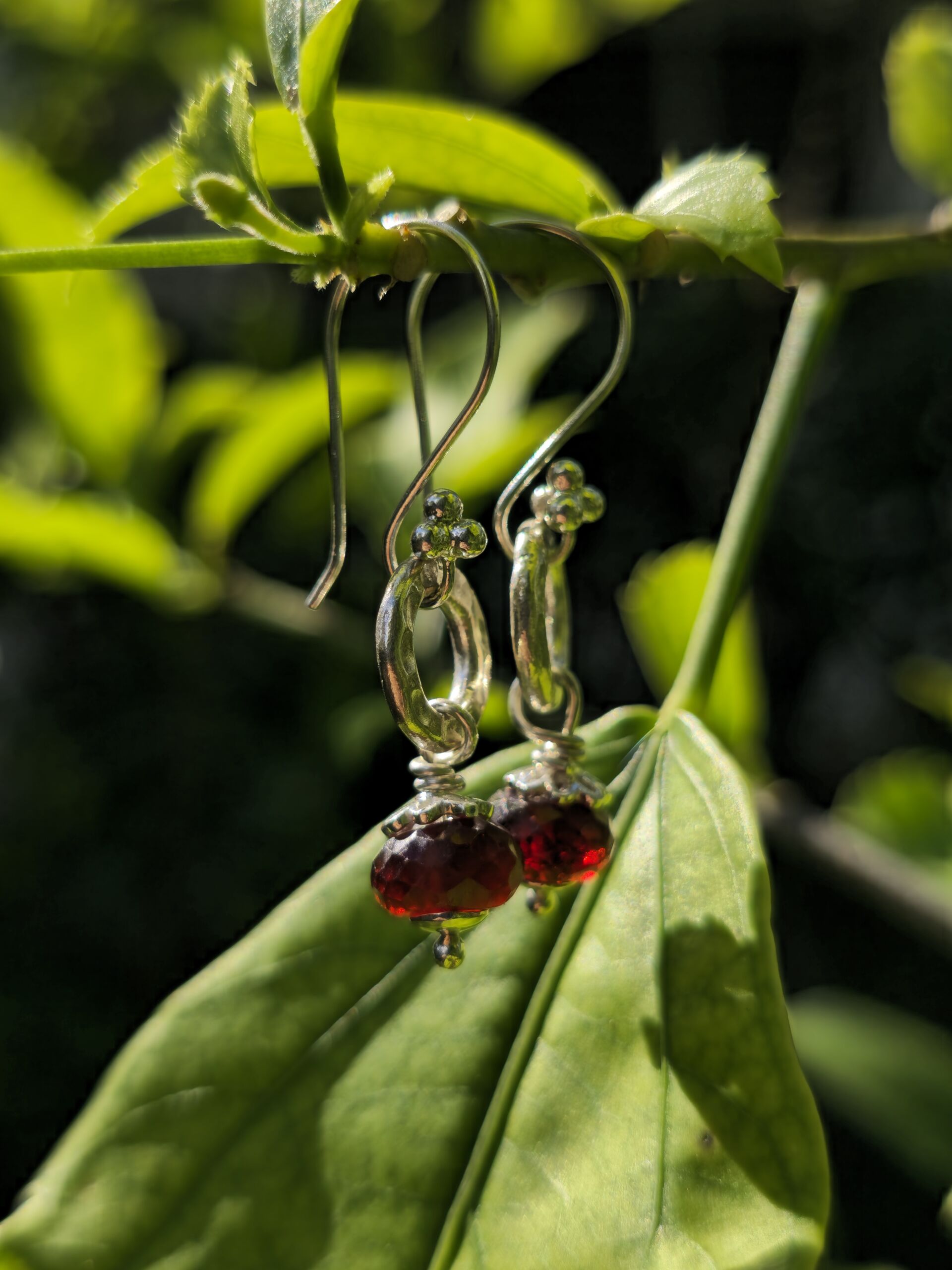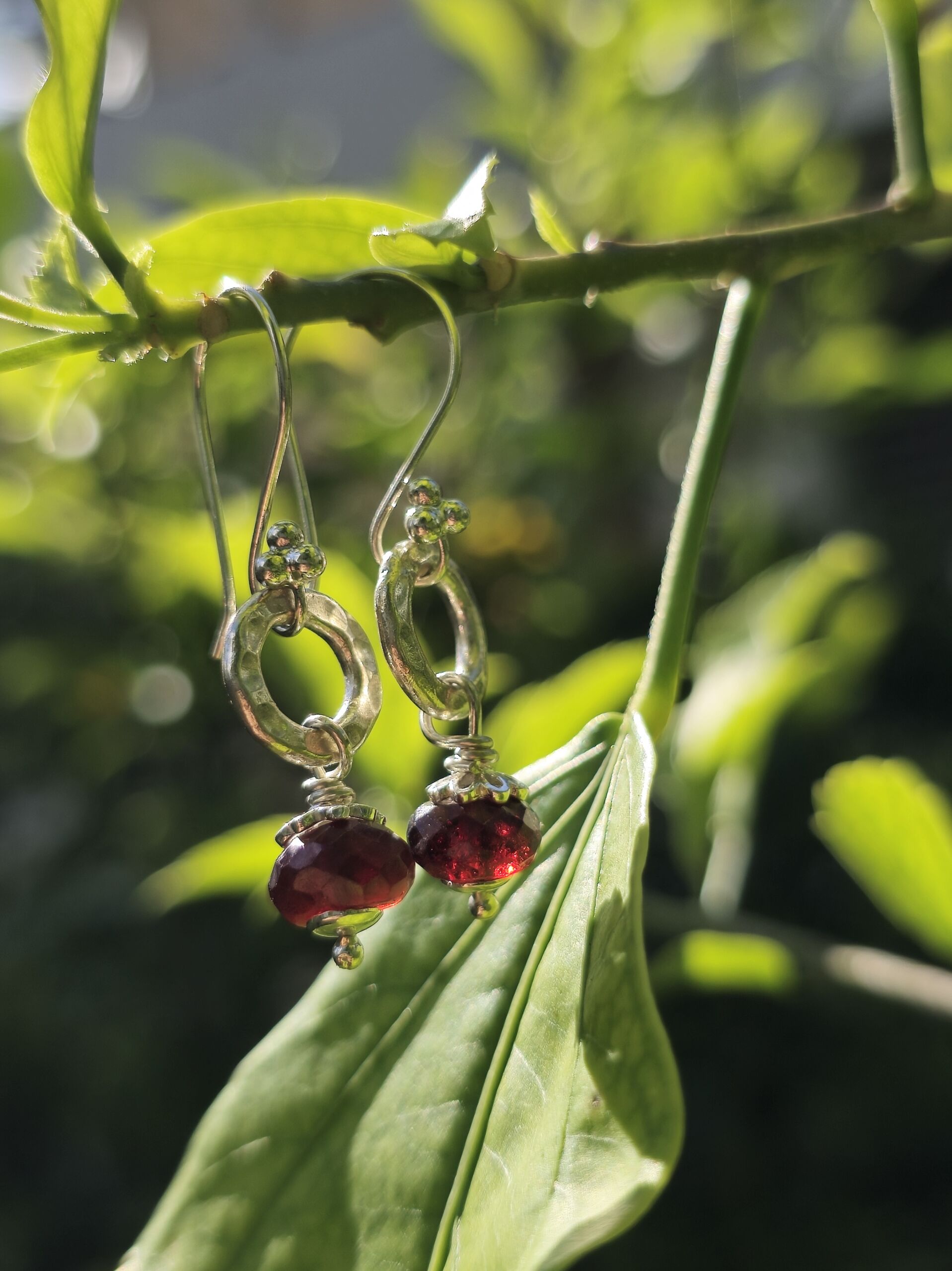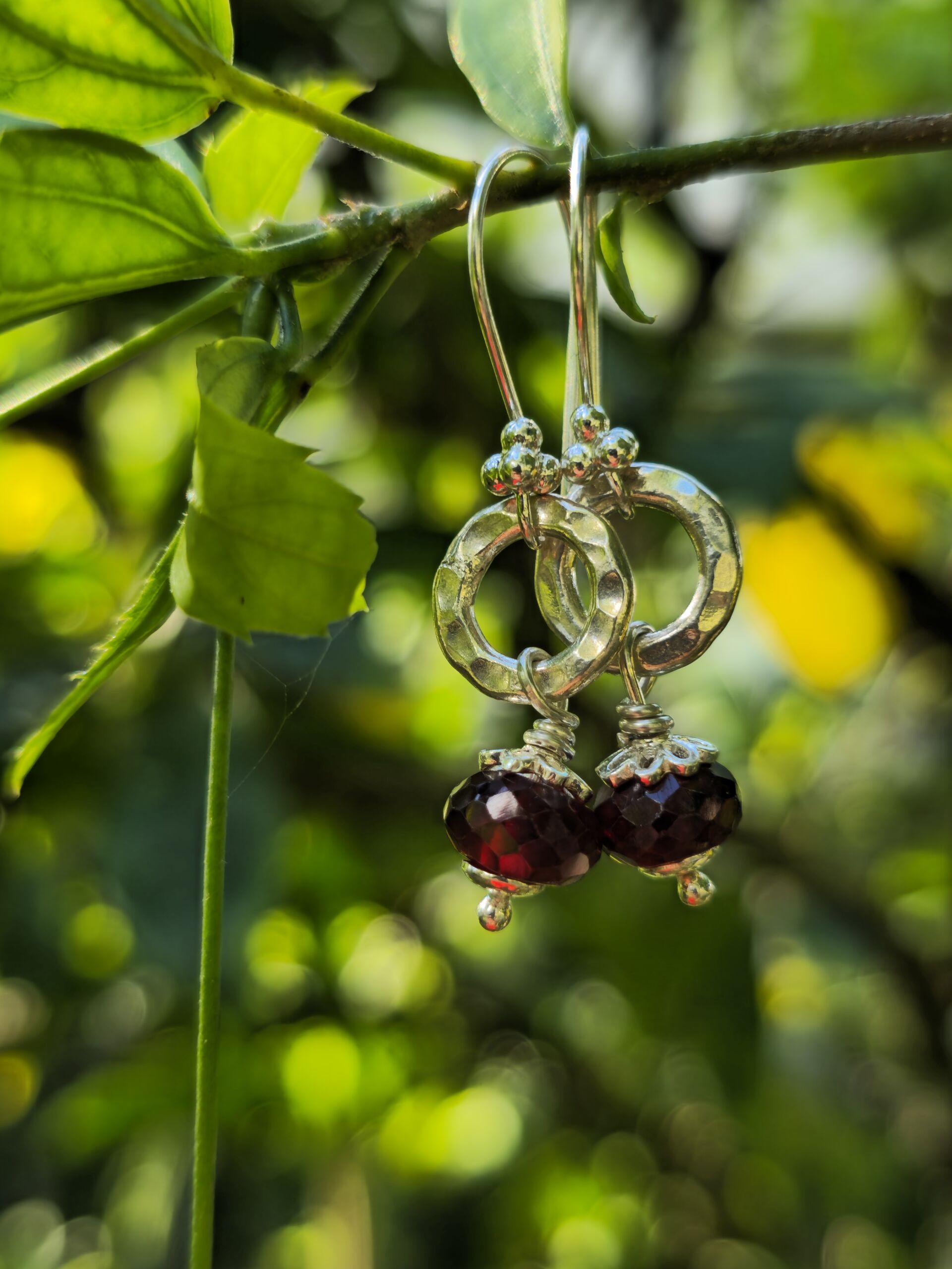 Rondelle di Granato rosso Pyrope sfaccettato 8 mm, cerchi in montatura di argento martellato.